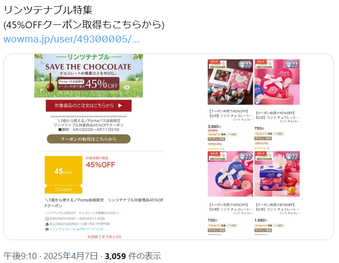 セール情報はいずれも15日付近にSNSで確認できたので、毎月中旬あたりにリンツを半額で買えるチャンスがあると考えてよさそうです。